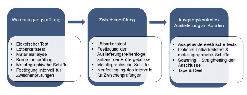 Bei der Zwischenprüfung werden die Bauteile erneut auf Lötbarkeit und intermetallisches Phasenwachstum der Anschlussmetallisierung untersucht. Abhängig vom Ergebnis kann dies akute Auswirkungen auf die weitere Verarbeitungsmöglichkeit oder Lagerfähigkeit der Bauteile haben: