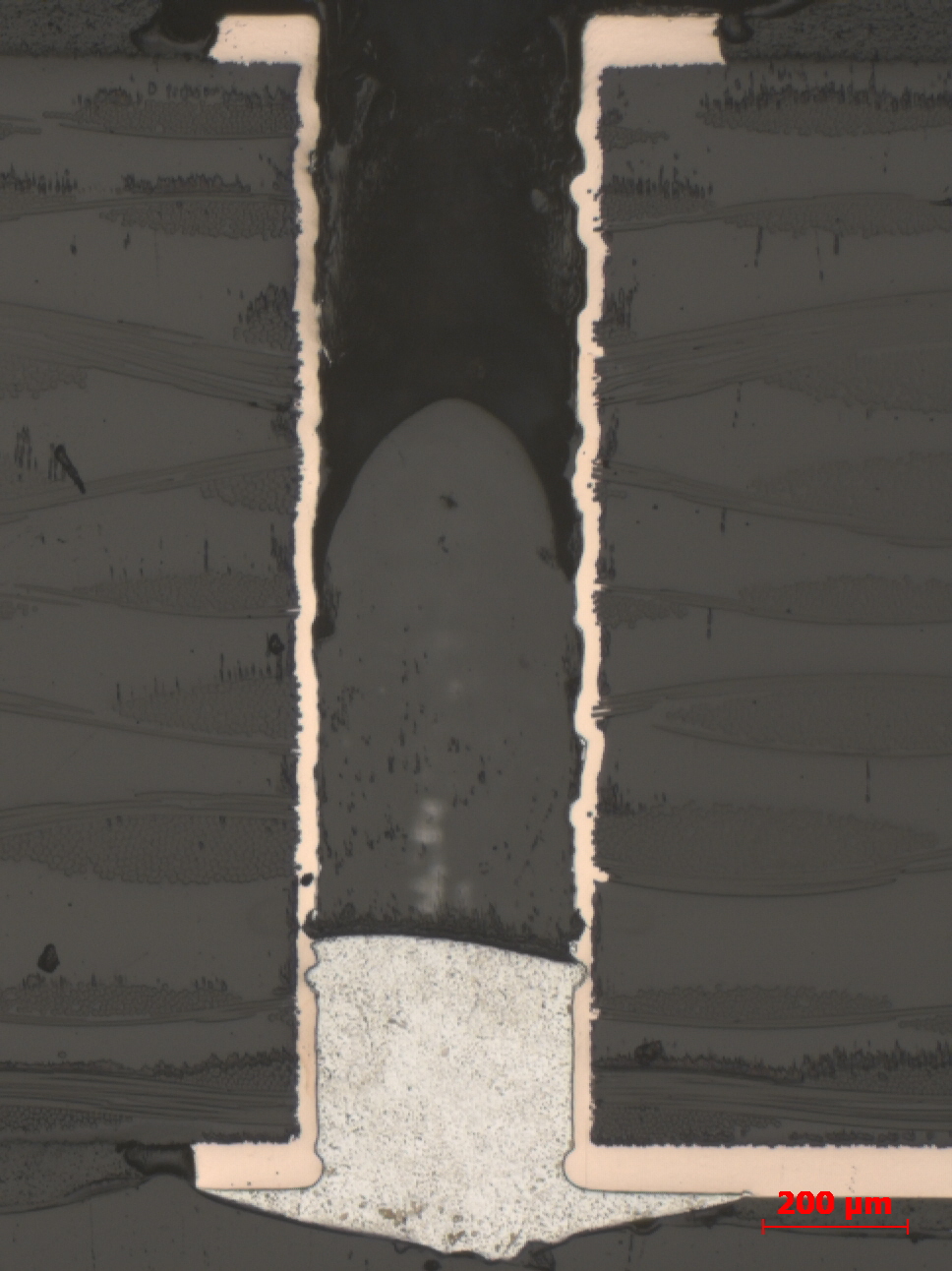 One of our front runners in failure analysis are Printed Circuit Boards (PCB). In our case of the month, the customer reported open connections at PCB level. Metallographic cross sections showed barrel cracking in the via metallization. The crack area also showed a lower thickness of the copper layer. The round shape of the void area was a clear indication for an etching attack. Our anamnesis of the process flow revealed a poor cleaning process during PCB manufacturing. Remaining process chemicals caused an etching process of the copper metallization. Thermal load during the board assembly/soldering process caused the crack formation in the thinned layer.