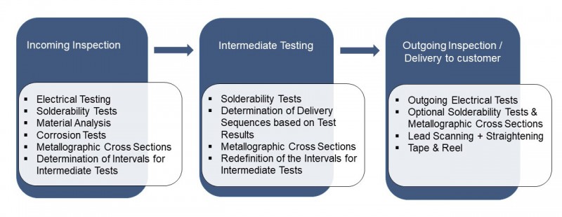 During the intermediate inspection, the components are again examined for solderability and intermetallic phase growth of the connection metallization. Depending on the result, however, this may also have acute effects on the further processability or storability of the components: