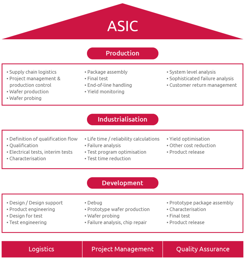 Overall there are three phases in ASIC projects – the development phase, the industrialisation phase and the production phase. Our goal is, to attend you competently in each phase of your ASIC project and to guarantee always only one contact person.